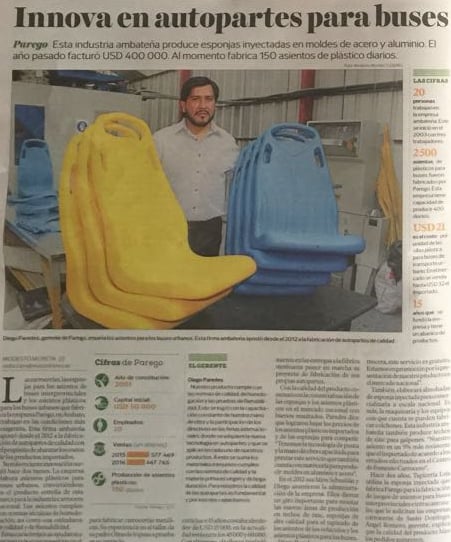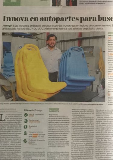 Pareco Cía. Ltda. nació en Ambato en 2001 con un capital inicial de USD 50.000. Inició fabricando autopartes metálicas y, desde 2012, apostó por la innovación con plásticos inyectados, desarrollando asientos más ligeros y resistentes para el transporte público. Gracias a esta visión, pasó de producir piezas tradicionales a fabricar más de 150 asientos plásticos diarios, generando empleo y posicionándose como un referente en la industria automotriz ecuatoriana.